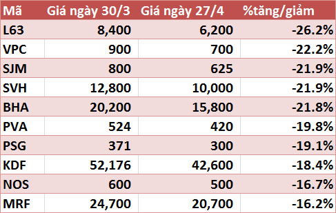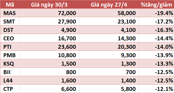Trong khi đó, dẫn đầu danh sách giảm giá sàn HNX là MAS với 19,4%. SMT và DST giảm lần lượt 17% và 16,3%.