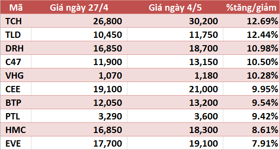 Ở chiều ngược lại, trong top 10 cổ phiếu tăng giá mạnh nhất sàn HOSE chỉ có 5 mã tăng giá trên 10%. Dẫn đầu danh sách này là TCH với 12,69%; tiếp đến là TLD với mức tăng 12%.