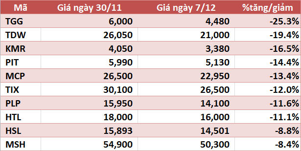 Chiều ngược lại, cổ phiếu TGG của Công ty Cổ phần Xây dựng và Đầu tư Trường Giang tiếp tục chuỗi ngày lao dốc từ tháng 8 đến nay. Chỉ riêng trong tuần đầu tháng 12, TGG đã mất 25,3% giá trị từ mức 6.000 đồng/CP xuống chỉ còn 4.480 đồng/CP.
