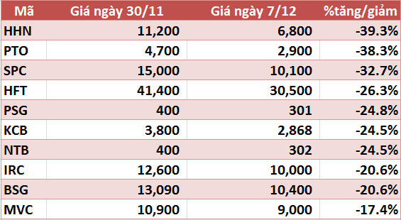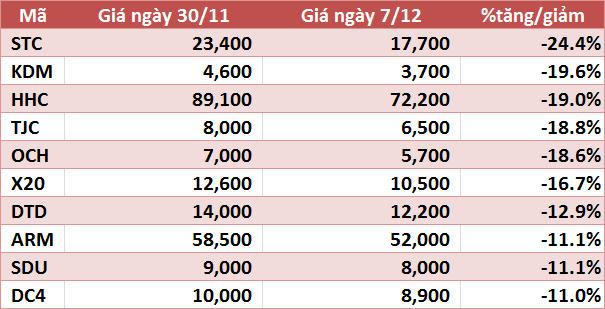 Chiều ngược lại, biên độ giảm của các cổ phiếu ở sàn HNX cũng không quá lớn. Dẫn đầu danh sách giảm giá là STC của Công ty Cổ phần Sách và Thiết bị trường học Tp. Hồ Chí Minh với 24,4% và đây cũng là cổ phiếu duy nhất trên HNX giảm giá trên 20%.