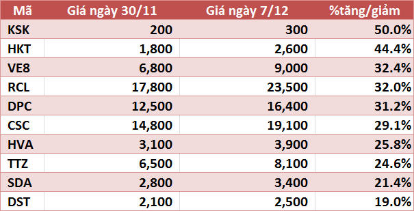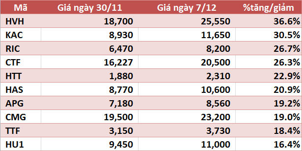 Trong khi đó, dẫn đầu danh sách tăng giá sàn HoSE là cổ phiếu HVH của Công ty Cổ phần Đầu tư và Công nghệ HVC. Sau phiên tăng trần ngày đầu lên sàn HoSE hôm 30/11, HVH đã có 4 phiên tăng trần và 1 phiên tăng mạnh cuối tuần. Tổng cộng, HVH đã tăng 36,6% chỉ sau 1 tuần giao dịch. Tiếp đến, cổ phiếu KAC của Công ty Cổ phần Đầu tư Địa ốc Khang An cũng tăng giá trên 30%, tuy nhiên, thanh khoản của KAC là rất kém, chỉ vài chục đến vài trăm cổ mỗi phiên.
