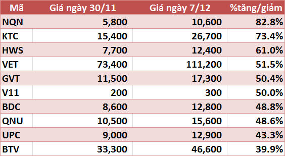 Ở sàn UPCoM, tương tự như các tuần trước đó, các cổ phiếu tăng giảm mạnh ở sàn này đều có thanh khoản rất thấp. Cổ phiếu NQN của Công ty Cổ phần Nước sạch Quảng Ninh có mức tăng giá lên đến 82,8%. Trong khi đứng đầu danh sách giảm giá là HHN của Công ty Cổ Phần Vận tải và Dịch vụ Hàng hóa Hà Nội với 39,3%.