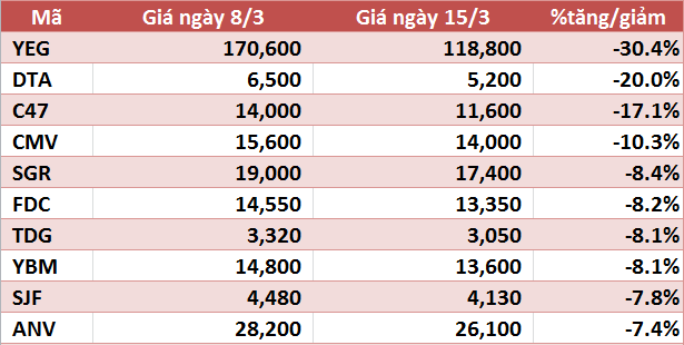 Ngoài YEG, sàn HoSE trong tuần qua chỉ có thêm 3 cổ phiếu giảm giá trên 10% đó là DTA của Công ty Cổ phần Đệ Tam, C47 của Công ty Cổ phần Xây dựng 47 và CMV của Công ty Cổ phần Thương nghiệp Cà Mau.