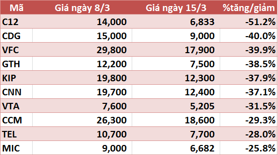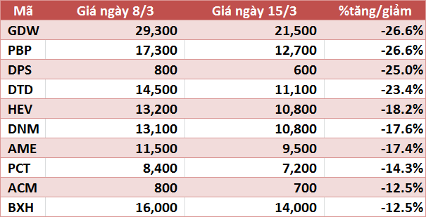 Chiều ngược lại, cổ phiếu GDW của Công ty Cổ phần Cấp nước Gia Định đứng đầu danh sách giảm giá sàn HNX với 26,62%. Trước đó, GDW đã có chuỗi tăng trần 6 phiên liên tiếp (từ 28/2- 7/3). Bên cạnh đó, cổ phiếu PBP của Công ty cổ phần Bao bì Dầu khí Việt Nam cũng giảm giá 26,6% trong tuần. Tuy nhiên, điểm chung của các cổ phiếu này là đều có thanh khoản rất thấp.