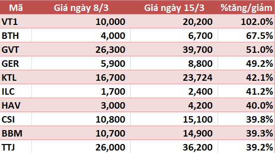 Trên sàn UPCoM, cổ phiếu VT1 của Công ty Cổ phần Vật tư Bến Thành đã tăng giá hơn 100% chỉ sau 1 tuần giao dịch từ mức 10.000 đồng/cp lên thành 20.200 đồng/cp. Dù vậy, thanh khoản của cổ phiếu này là rất thấp nên việc nhà đầu tư muốn tìm kiếm lợi nhuận lại không hề đơn giản. Tương tự với việc thanh khoản rất thấp, cổ phiếu BTH của Công ty Cổ phần Chế tạo Biến thế và Vật liệu điện Hà Nội cũng tăng giá đến 67,5%.