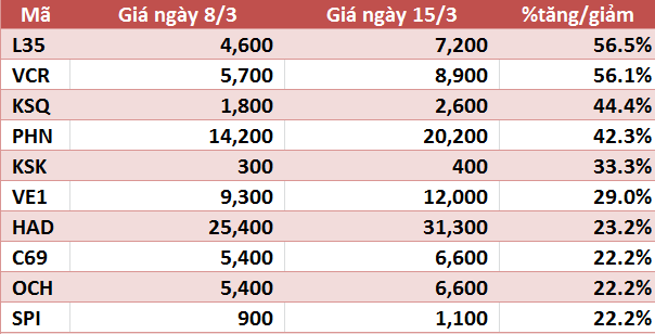 Trên sàn HNX, hàng loạt các cổ phiếu có thị giá thấp (dưới 10.000 đồng/cp) bứt phá mạnh. Cổ phiếu L35 của Công ty Cổ phần Cơ khí Lắp máy Lilama đứng đầu danh sách tăng giá sàn này với 56,5%. Trong tuần, L35 đã có 5 phiên tăng trần bất chấp viêc công ty mới nhận quyết định xử phạt về thuế.