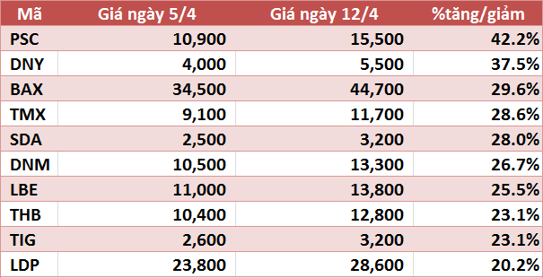 Đứng đầu danh sách tăng giá trên sàn HNX là PSC của Công ty Vận tải và Dịch vụ Petrolimex Sài Gòn với hơn 42%. DNY của Công ty Thép Dana - Ý đứng ngay sau với mức tăng giá là 37,5%. Cả hai mã đều có thanh khoản rất thấp.