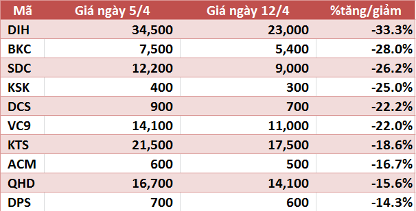 Trong khi đó, cổ phiếu DIH của Đầu tư Phát triển Xây dựng - Hội An có mức giảm giá mạnh nhất sàn HNX với 33,3%. Hiện tại trên thị trường cũng không có thông tin nào xuất hiện khiến cổ phiếu này 'rơi' mạnh như vậy. Các cổ phiếu giảm mạnh trên 20% còn có BKC, SDC, KSK, DCS hay VC9.