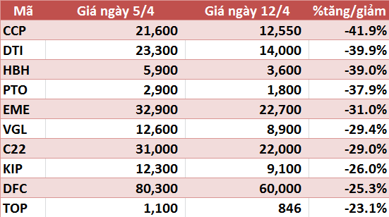 Nhóm cổ phiếu trên sàn HNX giảm mạnh nhất. Đồ hoạ: Bình An.