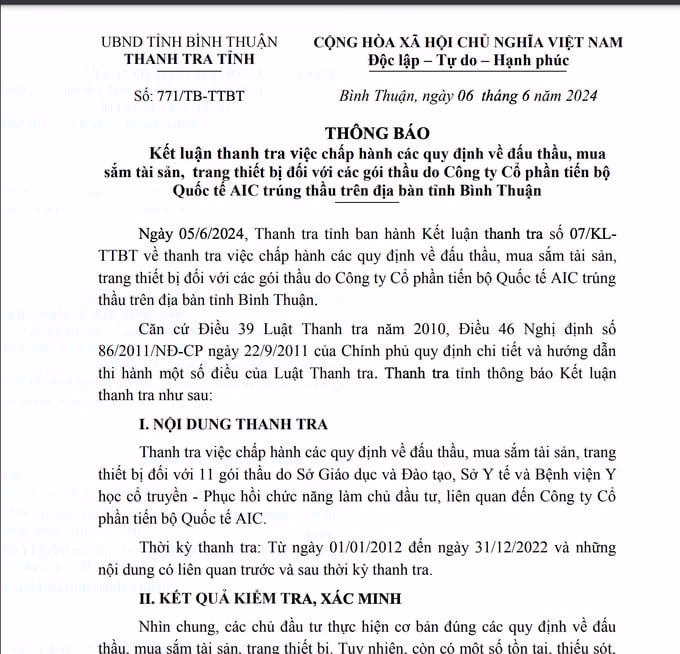 Theo đó, Thanh tra tỉnh Bình Thuận cho biết, thời kỳ từ 1/1/2012 đến 31/12/2022 có tới 10/11 gói thầu do Sở Giáo dục và Đào tạo, Sở Y tế, Bệnh viện Y học cổ truyền - Phục hồi chức năng làm chủ đầu tư, liên quan đến Công ty AIC đã có nhiều tồn tại, thiếu sót và có dấu hiệu tội phạm.