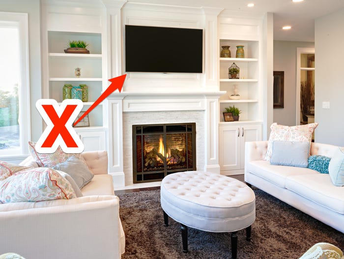 Thiết kế nội thất phòng khách không chỉ để có một không gian đẹp mà còn phải tính đến công năng của các đồ vật. "Có nhiều gia đình chọn treo TV lên cao để đẹp, hoặc tiết kiệm không gian nhưng điều này sẽ gây ảnh hưởng đến cổ của bạn. TV phải ngang tầm mắt với vị trí ngồi và bạn sẽ không cần phải nhìn lên", Lauren White nhấn mạnh.