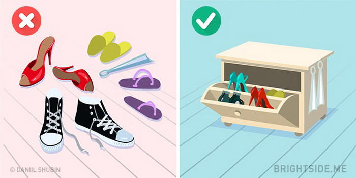 Các nhà thiết kế nội thất cho rằng sẽ thông minh hơn nếu bạn tìm được chỗ để cất giấu tất cả đống giày dép của bạn thay vì vứt tràn lan ở cửa nhà. Ví dụ, bạn có thể mua vài chiếc ngăn kéo đẹp mắt. kết quả bạn sẽ có nhiều không gian hơn và hành lang trông sẽ có tổ chức hơn.