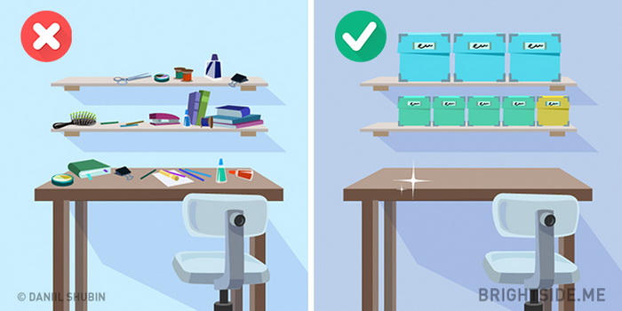 Tất nhiên những chiếc kệ mở sẽ giúp bạn “khoe” được những món đồ bạn trưng bày, nhưng đôi khi nó lại phản tác dụng nếu bạn không thể sắp xếp chúng gọn gàng và đẹp mắt. Để chắc chắn mọi thứ ở vị trí hợp lý, bạn cần sắp xếp nơi ở cho chúng. Ví dụ như bạn có thể kiếm những thùng giấy với lớp giấy bọc đẹp mắt và đáng yêu bên ngoài, hay những chiếc rổ mây để đựng giấy nhớ, vài thứ linh tinh mà bạn thường dùng lên trên kệ một cách gọn gàng.