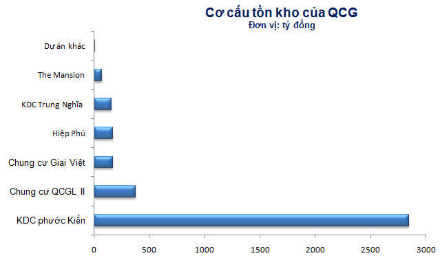 Quốc Cường Gia Lai (QCG) cũng là một trong những doanh nghiệp BĐS nằm trong top đầu về hàng tồn kho. Theo báo cáo tài chính của công ty này, tính đến 30/6/2015 giá trị hàng tồn kho ở mức 3.963 tỷ đồng, chủ yếu là các dự án đang triển khai dở dang. Trong đó, đáng chú ý Dự án khu dân cư Phước Kiển chiếm đến hơn 70% giá trị hàng tồn kho với 2.843 tỷ đồng, tiếp đến là Dự án chung cư QCGL II với 378 tỷ đồng hàng tồn kho.