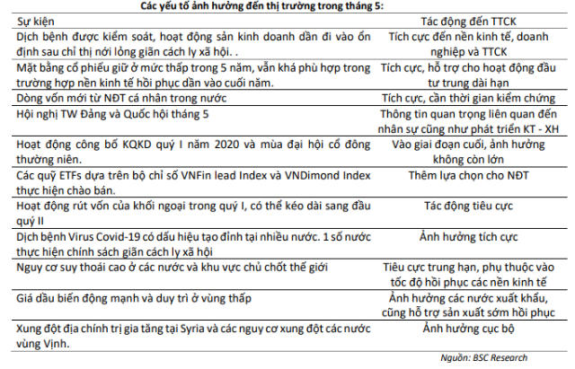 VDSC kỳ vọng có thể mang lại sự hưng phấn là tại những thời điểm có tiến triển khả quan về kiểm soát dịch bệnh và nới lỏng lệnh phong tỏa của Mỹ cùng với các quốc gia châu Âu, những nền kinh tế gắn liền với triển vọng xuất khẩu của Việt Nam. Dù vậy, yếu tố trên chỉ có tác dụng hỗ trợ ngắn hạn về mặt tâm lý. Triển vọng hồi phục hoạt động sản xuất, kinh doanh của nền kinh tế sau dịch bệnh vẫn là yếu tố cần được quan sát nhiều hơn. Trong tháng 5, VDSC dự báo VN-Index sẽ dao động trong khoảng 700-800 điểm.
