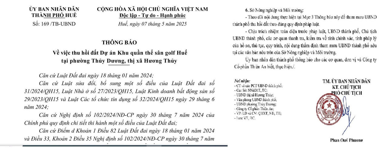 Mới đây, Phó Chủ tịch UBND TP. Huế Phan Quý Phương đã ký ban hành thông báo về việc thu hồi đất dự án khu quần thể sân golf Huế tại phường Thủy Dương, thị xã Hương Thủy, đối với Công ty cổ phần Thiên An.