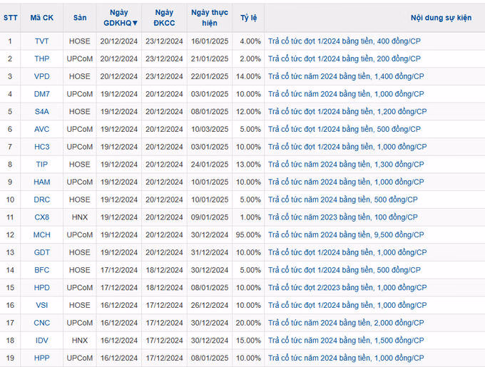 Theo thống kê, trong tuần 16/12– 20/12 có 19 doanh nghiệp thông báo chốt quyền cổ tức bằng tiền mặt với mức cao nhất là 95% và thấp nhất là 1%.