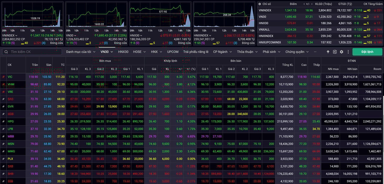 Khép lại phiên giao dịch ngày 5/8, thị trường chứng khoán Việt Nam tiếp tục duy trì đà tăng tích cực. Chỉ số VN-Index ghi nhận mức tăng gần 19 điểm, đóng cửa tại 1.547 điểm, trong khi VN30 bứt phá mạnh mẽ hơn, tăng hơn 37 điểm và chốt phiên ở mức 1.690 điểm.