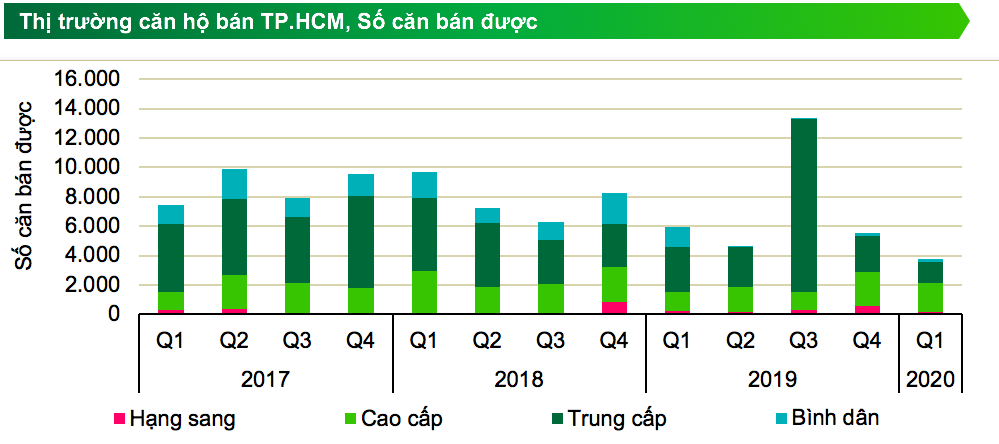 Xét về tỷ lệ giữa các phân khúc sản phẩm, phân khúc trung cấp tiếp tục chiếm phần lớn với 58% tổng nguồn cung trong quý I/2020, tạo nền tảng bền vững cho thị trường bằng việc đáp ứng nhu cầu thực về nhà ở của người mua. Xét về vị trí, thị trường căn hộ tại TP.HCM tiếp tục mở rộng về phía Đông và Nam tập trung tại quận 2, quận 7, quận 9 và Bình Chánh.