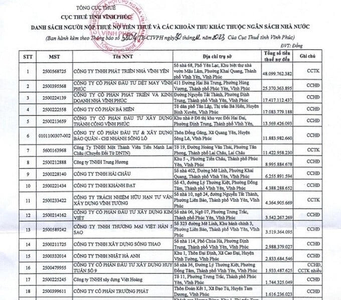 Ngoài Công ty TNHH Phát triển nhà Vĩnh Yên đứng đầu với số nợ gần 49 tỷ đồng, còn có Công ty CP đầu tư dệt may Vĩnh Phúc nợ thuế hơn 25 tỷ đồng; CTCP Phát triển và kinh doanh nhà Vĩnh Phúc nợ thuế hơn 17 tỷ đồng...