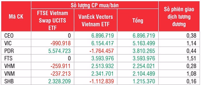 Tổng hợp mua - bán 2 quỹ ETF, CEO được dự báo là cổ phiếu được mua nhiều nhất trong đợt tái cơ cấu tới với gần 6,9 triệu đơn vị. Theo sau là VIC với gần 5,2 triệu đơn vị. Trong khi đó, PDR và FRT đều có thể được mua vào trên 3 triệu đơn vị.