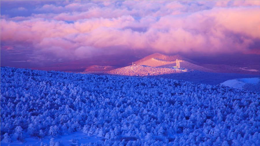 Tuyết trên núi Taebaek: Tỉnh Gangwon nổi tiếng với tuyết rơi dày trong mùa đông. Tuy gây trở ngại khi lái xe, thời tiết tạo nên khu trượt tuyết tốt nhất Hàn Quốc. Khu nghỉ mát High1 có đỉnh cao nhất (1.345 m) và tuyết bông nhất trong số các khu nghỉ dưỡng trượt tuyết ở đây. Đền Manggyeongsa nằm trên núi Taebaek, ở độ cao 1.460 m so với mực nước biển. Ảnh: Korea Tourism Organization.