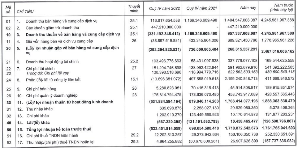 Còn tại Tổng công ty Phát triển Đô thị Kinh Bắc (HoSE: KBC), mặc dù ghi nhận quý IV có doanh thu âm, lỗ kỷ lục nhưng kết thúc năm 2022, KBC ghi nhận lợi nhuận trước thuế năm 2022 đạt 1.719 tỷ đồng, giảm 2,4% và lợi nhuận sau thuế đạt 1.595 tỷ đồng, tăng 18% so với năm trước.