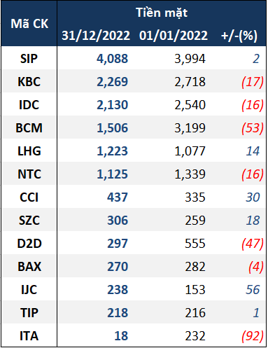 Tại IDC, lượng tiền mặt còn 2.130 tỷ đồng, giảm 16% so với đầu năm là 2.540 tỷ đồng; KBC đang nắm giữ 2.269 tỷ đồng giảm 17% so với cùng kỳ là 2.718 tỷ đồng; BCM đang nắm giữ 1.506 tỷ đồng, giảm mạnh tới 53% so với cùng kỳ là 3.199 tỷ đồng; ITA chỉ còn 18 tỷ đồng, giảm tới 92% so với cùng kỳ đạt 232 tỷ đồng.