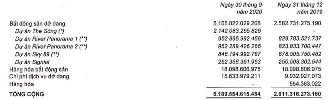 Hàng tồn kho tính đến 30/9/2020 là 5.190 tỷ đồng, tăng gần gấp đôi so với hồi đầu năm. Trong đó, dự án The Sóng có giá trị tồn kho lớn nhất với 2.142 tỷ đồng, chiếm tỷ lệ hơn 40% hàng tồn kho của doanh nghiệp. Tiếp đến là các dự án River Panorama 1 và 2...