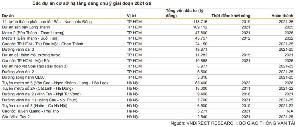 Việc thúc đẩy phát triển cơ sở hạ tầng được đánh giá là có tác động trực tiếp tới thị trường bất động sản, sẽ trở thành động lực tăng trưởng chính của bất động sản trong các năm tới. Một số dự án có tác động tích cực tới thị trường bất động sản đã/dự kiến khởi công trong 2021 được kể tới bao gồm: Sân bay quốc tế Long Thành giai đoạn 1 (khởi công đầu năm 2021); 6/11 dự án thành phần cao tốc Bắc Nam đang được thi công và 5 dự án còn lại được kỳ vọng sẽ khởi công trong 2021.