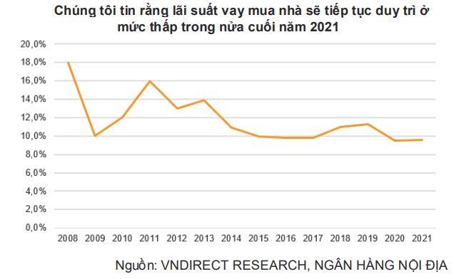 Mặc dù không kỳ vọng NHNN sẽ cắt giảm thêm lãi suất điều hành, nhưng VNDirect tin rằng NHNN sẽ không nâng lãi suất năm 2021 nhằm tiếp tục hỗ trợ nền kinh tế bằng cách duy trì nới lỏng chính sách tiền tệ. Theo đó, lãi suất cho vay thế chấp được kỳ vọng sẽ được duy trì ở mức thấp trong năm 2021, từ đó hỗ trợ kích cầu bất động sản.