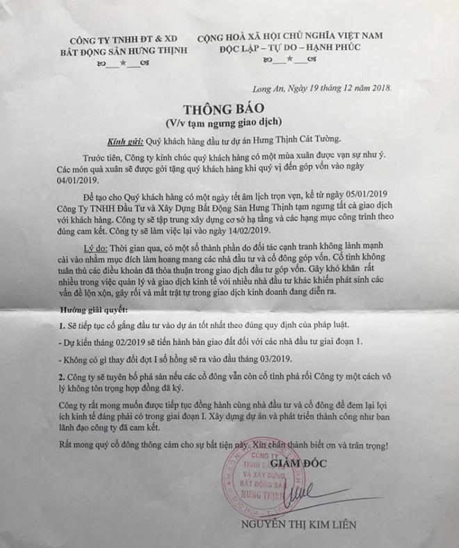 Ngày 19/12/2018, Công ty TNHH Đầu tư và Xây dựng bất động sản Hưng Thịnh gửi thông báo tới khách hàng về việc tạm dừng giao dịch dự án Hưng Thịnh Cát Tường tại huyện Đức Hòa, tỉnh Long An.