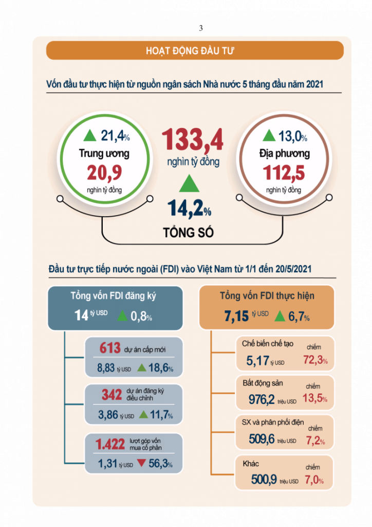 Tính chung 5 tháng đầu năm 2021, vốn đầu tư thực hiện từ nguồn ngân sách Nhà nước đạt 133,4 nghìn tỷ đồng, bằng 28,7% kế hoạch năm và tăng 14,2% so với cùng kỳ năm trước (cùng kỳ năm 2020 bằng 22,8% và tăng 16,2%), gồm: Vốn Trung ương quản lý đạt 20,9 nghìn tỷ đồng, bằng 27,1% kế hoạch năm và tăng 21,4% so với cùng kỳ năm trước; vốn địa phương quản lý đạt 112,5 nghìn tỷ đồng, bằng 29% kế hoạch năm và tăng 13%.