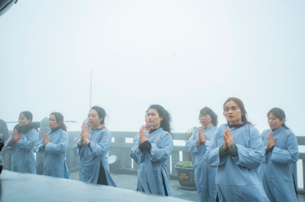 Mây trắng ùa về nơi quần thể tâm linh , bỗng chốc khiến khung cảnh đẹp tựa chốn bồng lai tiên cảnh, hàng chục thành viên đã dành 15 phút để ngồi thiền định tại sân mây. Nguyễn Huyền - Nữ hoàng Yoga sống khỏe 2021 chia sẻ: “Khi tới đỉnh thiêng Fansipan, mình đã cảm nhận được linh khí đất trời, con người và thiên nhiên như được hòa làm một”.