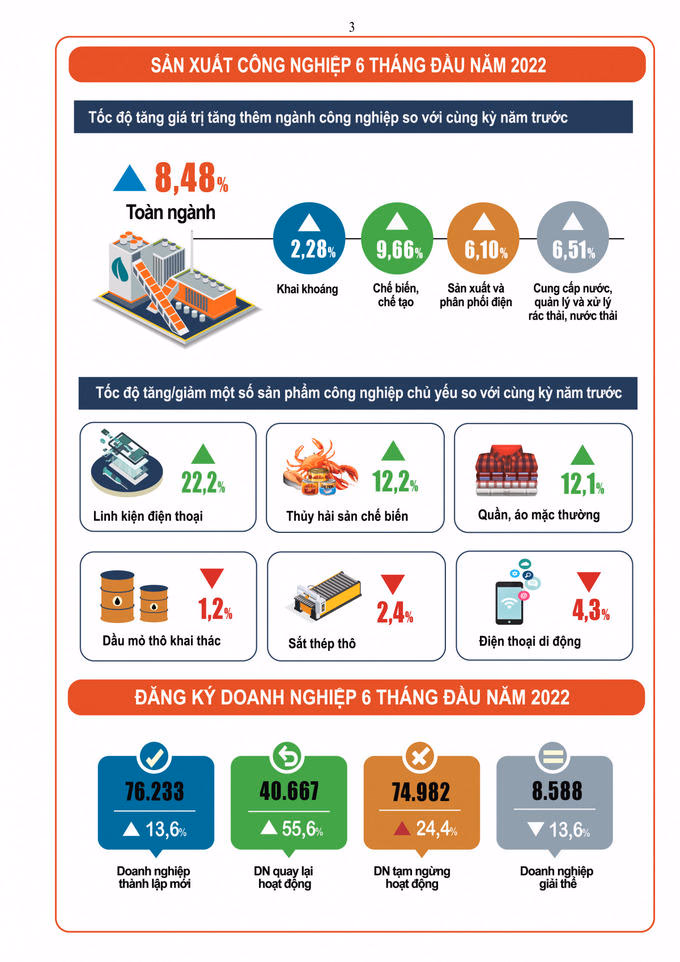 Khu vực nông, lâm nghiệp và thủy sản có mức tăng trưởng khá cao khẳng định chuyển đổi cơ cấu ngành đã phát huy hiệu quả, bảo đảm nguồn cung lương thực, thực phẩm, hàng hóa thiết yếu. Hoạt động sản xuất công nghiệp chế biến, chế tạo tiếp tục giữ vai trò quan trọng trong thúc đẩy tăng trưởng kinh tế 6 tháng đầu năm 2022. Tiến độ giải ngân vốn đầu tư công được cải thiện rõ rệt, tốc độ tăng vốn đầu tư thực hiện từ nguồn ngân sách Nhà nước đạt mức cao, an sinh xã hội được quan tâm thực hiện.