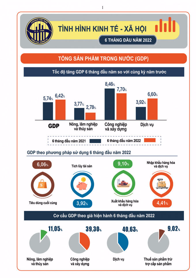 Trong 6 tháng đầu năm 2022, GDP tăng 6,42%, cao hơn tốc độ tăng 2,04% của 6 tháng đầu năm 2020 và tốc độ tăng 5,74% của 6 tháng đầu năm 2021.