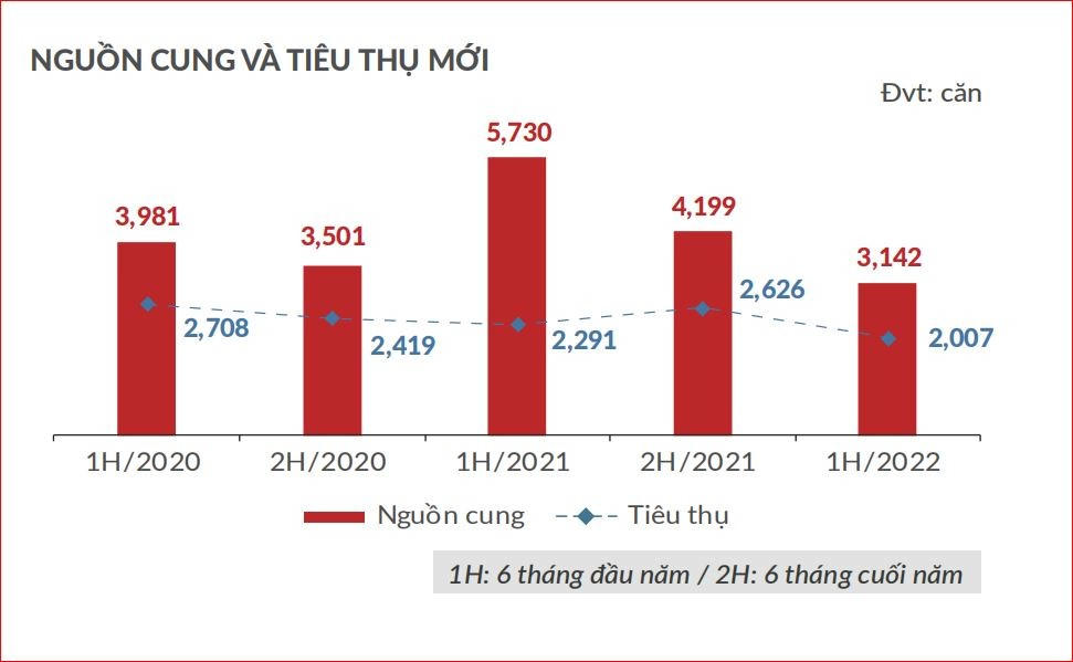 Nguồn cung mới ra thị trường đạt 3.142 căn, chỉ bằng 55% so với cùng kỳ (svck) năm 2021 (5.730 căn), bằng 75% so với 2 quý trước đó (4.199 căn). Tỷ lệ hấp thụ của thị trường đạt gần 64% tổng nguồn cung (2.007 căn), bằng 88% svck năm 2021 (2.291 căn), và bằng gần 77% so với 2 quý trước đó (2.626 căn).