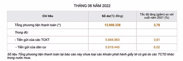 Trong đó, tiền gửi của khách hàng là tổ chức kinh tế đạt gần 5,85 triệu tỷ đồng, tăng gần 42.000 tỷ trong tháng 6 và tăng hơn 200.000 tỷ trong nửa đầu năm.
