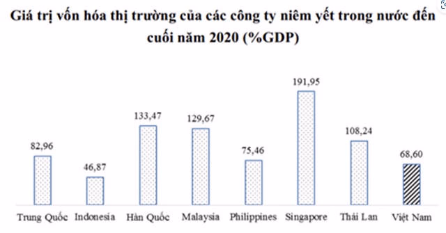 Thứ nhất, ông cho rằng các cấu phần của thị trường chưa cân đối, cơ cấu thị trường vốn còn nhỏ so với các thị trường khu vực. Cụ thể, tại thời điểm 30/6/2022, vốn hóa thị trường cổ phiếu đạt khoảng 70,9% GDP, nhỏ hơn các thị trường cổ phiếu trong khu vực (từ 93% - 243% GDP, ngoại trừ Indonesia). Trong đó, khoảng 35% tổng vốn hóa thị trường thuộc sở hữu Nhà nước, còn hạn chế về sở hữu và tính thanh khoản. Ông cũng cho hay, dư nợ thị trường trái phiếu là 47% GDP còn thấp hơn khá nhiều so với thị trường cổ phiếu và một số thị trường khu vực.