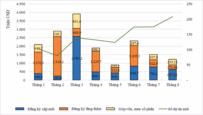 Trong 8 tháng qua, có 1.135 dự án mới được cấp giấy chứng nhận đăng ký đầu tư, với tổng vốn đăng ký đạt trên 6,35 tỷ USD, giảm 43,9% so với cùng kỳ.