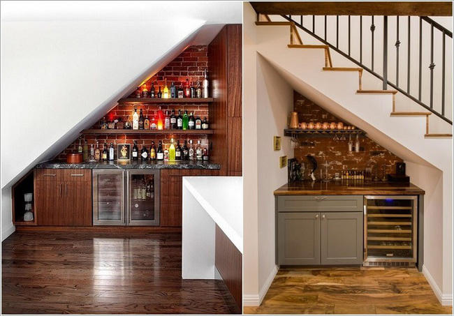 Ngoài ra, việc đặt một quầy bar trong nhà cũng là xu hướng thiết kế hiện nay. Và nó càng đặc biệt hơn, càng cho thấy sự sáng tạo khi vị trí đặt quầy bar được tận dụng từ chính gầm cầu thang.