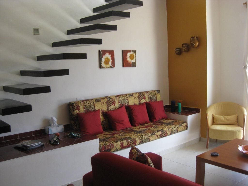 Góc giao nhau giữa cầu thang và một phần tường giúp bạn có được nơi kê sofa tiếp khách, ngồi nghỉ ngơi ngay gần cửa ra vào.