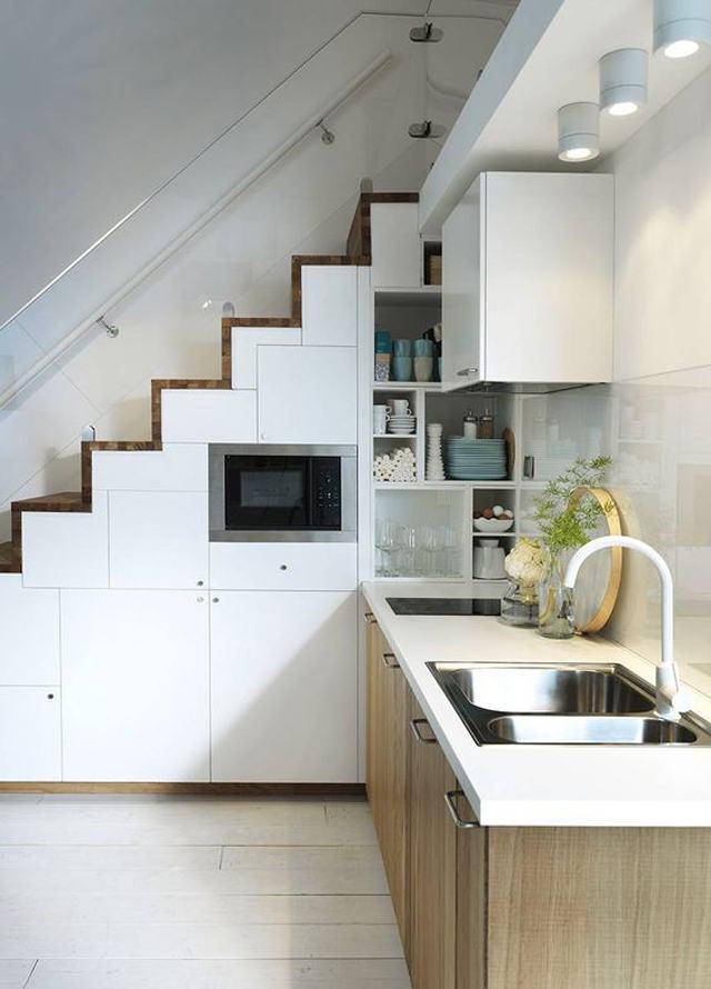 Nếu cầu thang nhà bạn nằm ở một vị trí sâu trong nhà, không sát với phòng khách thì bạn nên tận dụng khu vực này để đặt phòng bếp. Gầm cầu thang có thể được dùng làm khu vực nấu nướng, đặt bếp lò hay tủ đồ.
