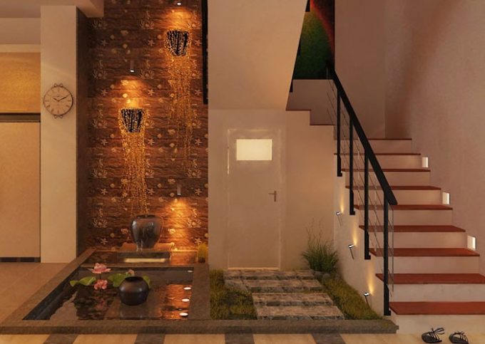 Thiết kế một tiểu cảnh dưới chân cầu thang giúp tạo khoảng xanh cho không gian vốn chật hẹp và tránh bụi bặm, ẩm mốc khi không sử dụng đến.
