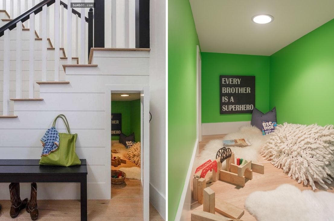 Thực tế cho thấy là gầm cầu thang có thể nhỏ trong mắt bạn nhưng sẽ là một không gian lớn trong mắt lũ trẻ. Hãy thoải mái tận dụng điều này cho sức sáng tạo của mình và bọn trẻ.