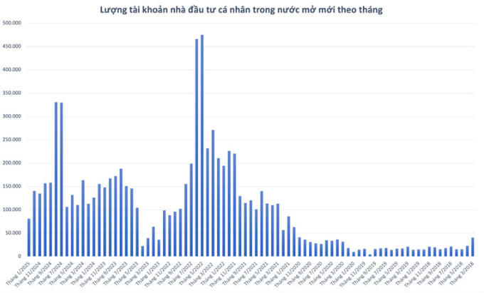 Tài khoản mở mới trong tháng đầu năm chủ yếu đến từ nhà đầu tư cá nhân, trong khi tổ chức chỉ có thêm 52 tài khoản. Tính đến cuối tháng 1/2025, nhà đầu tư cá nhân trong nước có tổng cộng hơn 9,3 triệu tài khoản, tương đương khoảng 9% dân số, hoàn thành mục tiêu trước thời hạn 2025 và đang hướng đến 11 triệu tài khoản vào năm 2030.