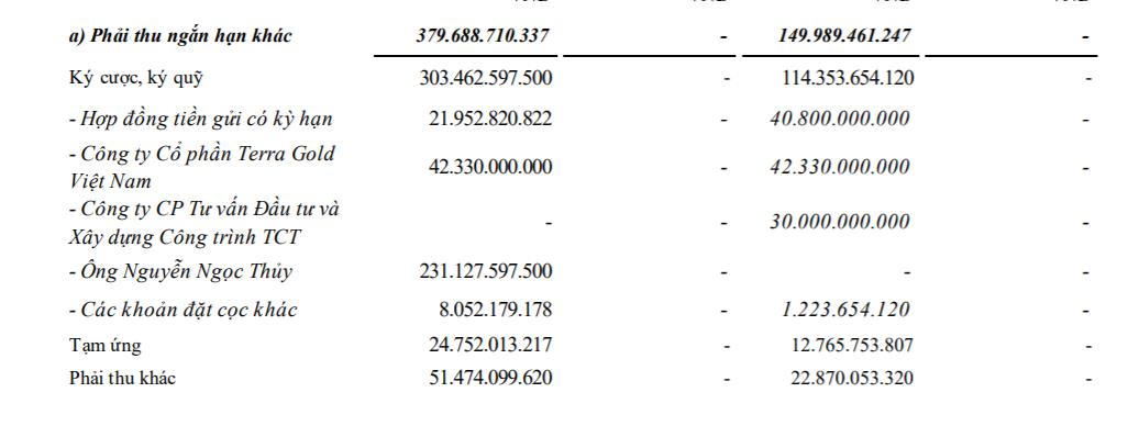 Do vậy, ông đã tạm ứng tại Apax Hodlings, khiến khoản thu ngắn hạn của Apax Hodlings tăng gấp đôi so với đầu năm, lên tới 538,2 tỷ đồng, do chyển hơn 231 tỷ đồng cho ông Thủy, chủ yếu là khoản tạm ứng ngắn hạn, đặt cọc và lãi đặt cọc mua cổ phần Apax English theo thỏa thuận chuyển nhượng.