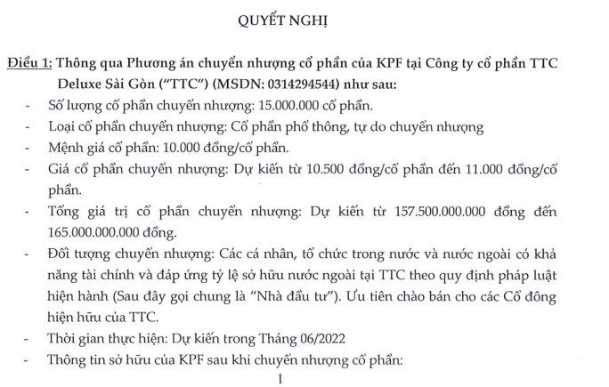 Tổng giá trị cổ phần chuyển nhượng dự kiến từ 157,5 tỷ đồng đến 165 tỷ đồng. Đối tượng chuyển nhượng là các cá nhân, tổ chức trong nước và nước ngoài có khả năng tài chính và đáp ứng tỷ lệ sở hữu nước ngoài tại TTC.