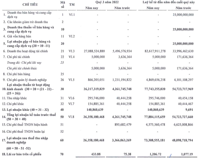 Lũy kế 9 tháng đầu năm, Công ty không ghi nhận doanh thu trong khi cùng kỳ ghi nhận 25 tỷ đồng. Lợi nhuận sau thuế là 73,31 tỷ đồng, tăng 52,4% so với cùng kỳ. Trong đó, lợi nhuận tăng cũng đến từ hoạt động tài chính.