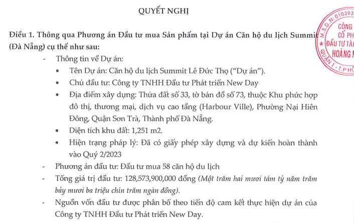 Chưa dừng lại ở đó, ngày 30/9 vừa qua, KPF cũng đã thông qua phương án đầu tư mua sản phẩm tại Dự án Căn hộ du lịch Summit Lê Đức Thọ (Đà Nẵng). Doanh nghiệp muốn chi 128,57 tỷ đồng để mua 58 căn hộ du lịch tại dự án Căn hộ du lịch Summit Lê Đức Thọ (tương ứng 2,22 tỷ đồng/một căn).